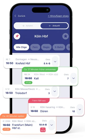 Sehen Sie sofort Abfahrts- oder Ankunftszeit, Gleisnummer und mögliche Verspätungen – alles in Echtzeit.